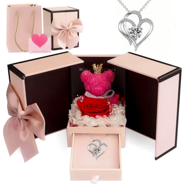 Elegantný darčekový set obsahujúci roztomilého medvedíka z machu, konzervované kvety, ktoré nikdy nevädnú, a štýlový náhrdelník – všetko elegantne zabalené v luxusnej šperkovnici. Dokonalý darček plný emócií pre každú výnimočnú príležitosť. Prekvapte milovanú osobu darom, ktorý vydrží navždy.