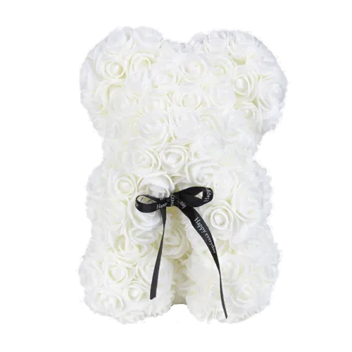 Každý kus je zostavený z viac ako 300 jemných penových ružičiek z foamiranu – materiálu, ktorý je príjemný na dotyk, hypoalergénny a dlhotrvajúci. Biely macko z ruží nepotrebuje žiadnu starostlivosť – stačí ho nevystavovať priamemu slnku a bude zdobiť váš interiér roky.