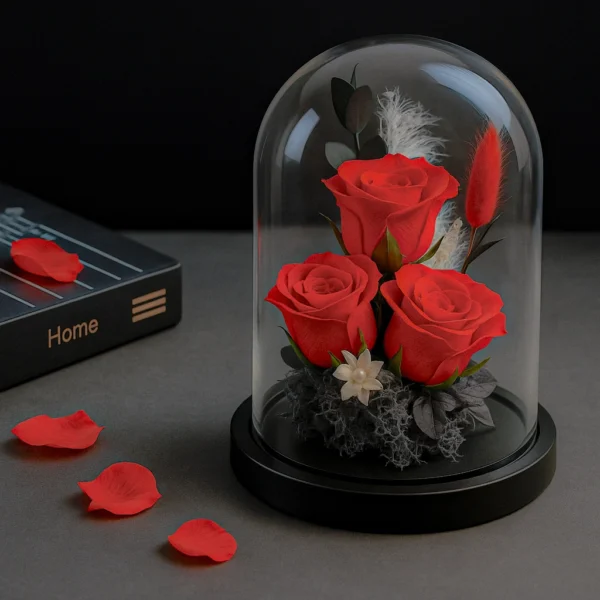 Pred vami je Premium trojitá červená ruža v kupole – dokonalý darček, ktorý uchváti svojou eleganciou a výnimočnosťou. Zabudnite na kvety, ktoré zvädnú za pár dní. Táto úžasná kompozícia troch červených ruží v ochrannej sklenenej kupole si zaslúži miesto v každom domove.