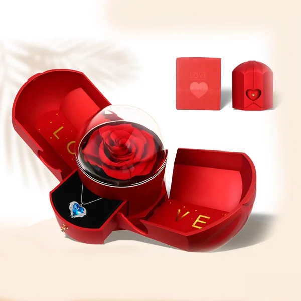 Tento multifunkčný darček kombinuje praktickú šperkovnicu s romantickou dekoratívnou ružou – všetko v jednom luxusnom balení, ktoré symbolizuje trvalú lásku a elegantnú starostlivosť o cenné šperky.